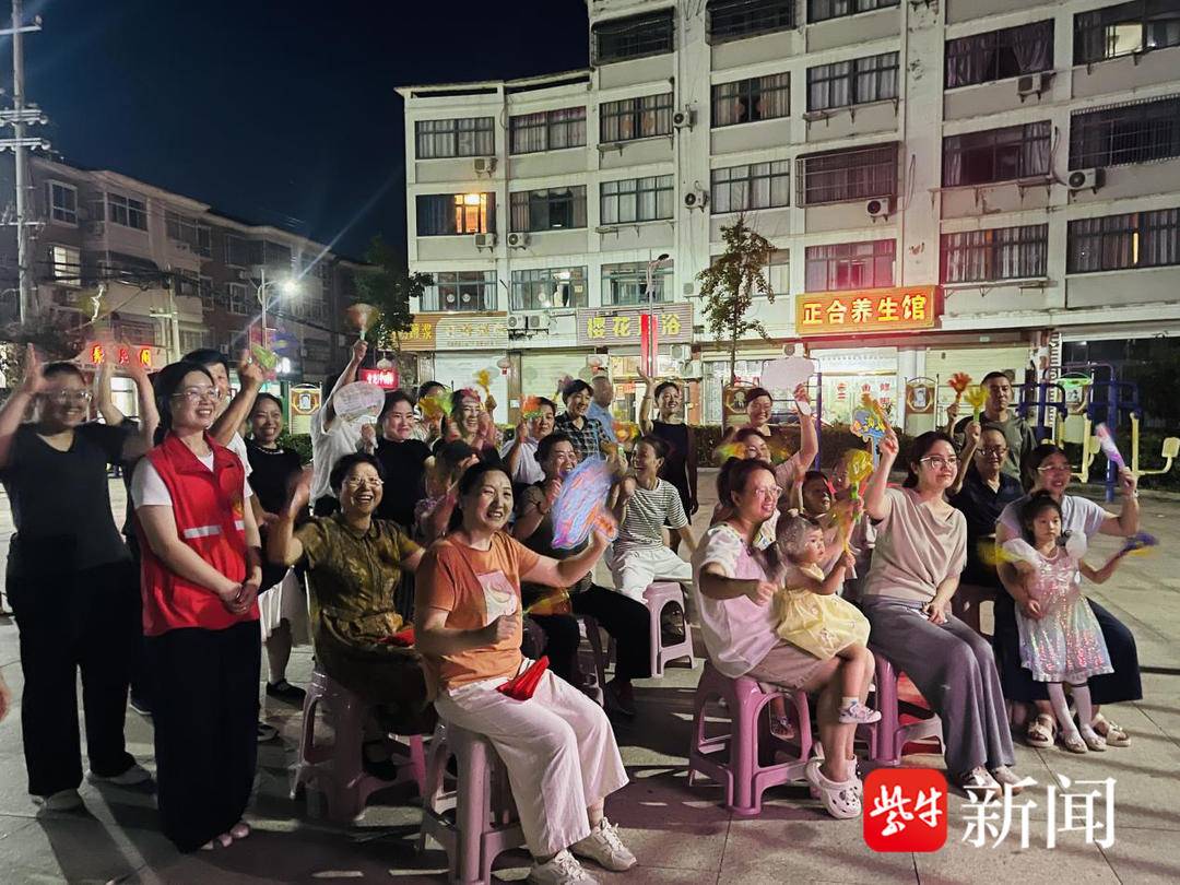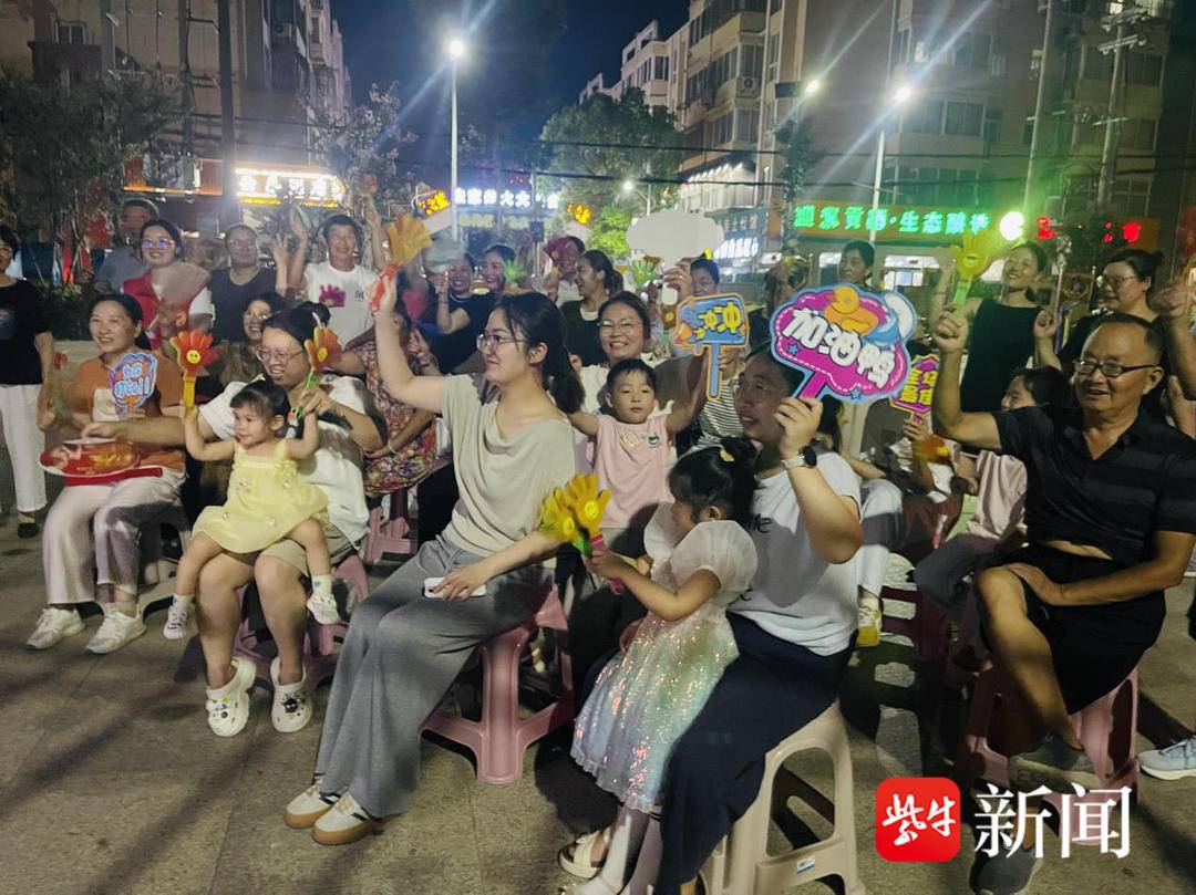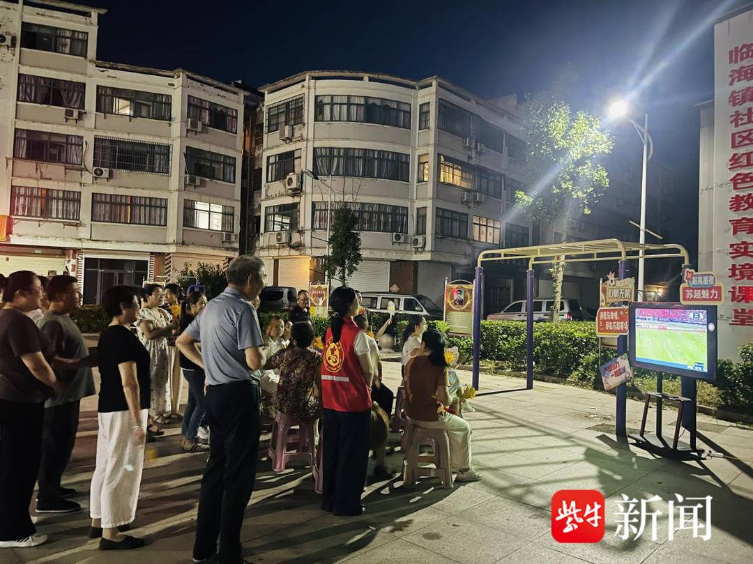 8月3日19:30,江苏苏超联赛盐城对阵常州的较量,“点亮星夜——绿茵燃情夜”观看直播活动在盐城市射阳县临海镇新时代文明实践所门口的小广场拉开序幕。大家带着凳子,满怀期待地准备为盐城队加油助威,连平时雷打不动跳广场舞的刘叔、刘婶也被吸引,群众手里的“小手掌”和“为你打Call”牌成了最亮眼的装饰。