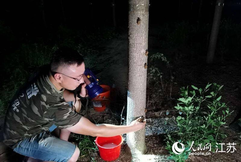 “金蝉哥”基地里,村民老宋用手电筒扫过树干,一只黑蚱正往上爬,遇到缠在树上的胶带,“扑通”掉进他装有水的塑料杯里。“一晚上抓了有四五百只!”他说。